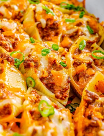 These taco stuffed shells are super easy to make! Just stuff the shells with the filling, top with some cheese, …