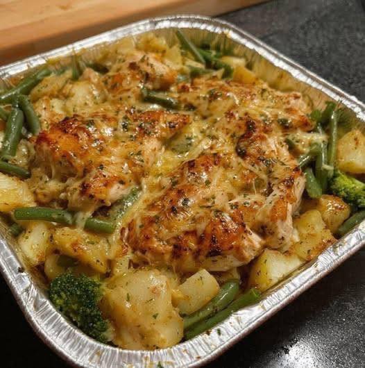Place chicken, potatoes, beans, broccoli…in pan. Then sprinkle Italian pack over everything then drizzle the butter and cheese over top. Cover with foil and bake at 350 for an hour and 10 minutes.